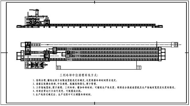 3.1 結(jié)構(gòu)合理,輔線運(yùn)轉(zhuǎn)方向隨造型機(jī)選定而確定,長度根據(jù)冷卻時間要求選定。