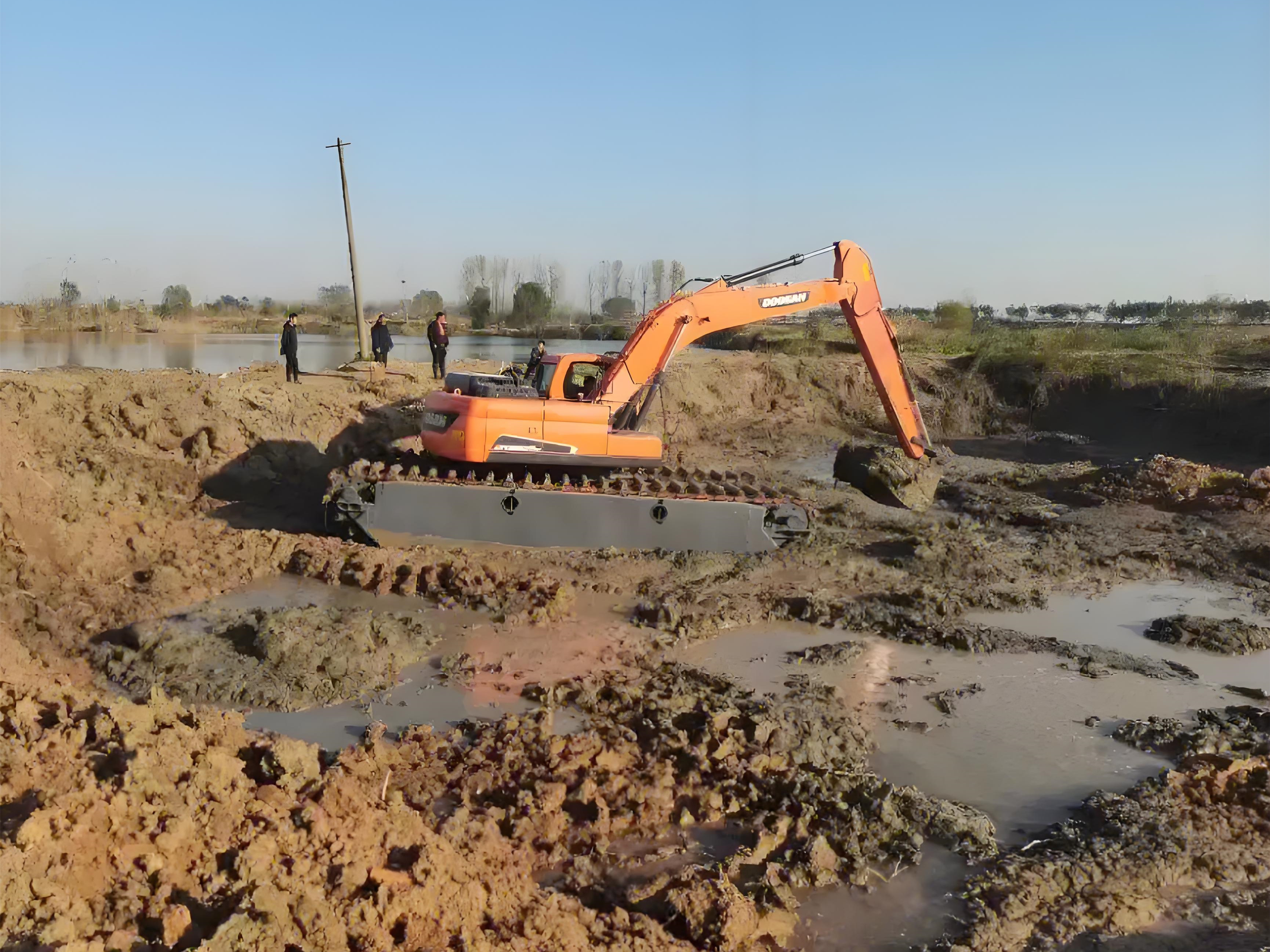 比如蘭州周邊的鄉(xiāng)村溝渠,雨季時水深 0.5 米左右,淤泥厚度 0.2 米,用兩棲式水上挖機就能直接作業(yè),不用先抽水,還能避免人工清淤效率低的問題。不過要注意:兩棲式挖機的作業(yè)半徑有限(一般 5-8 米),適合窄小水域,要是水庫這種大面積水域,還是得用常規(guī)浮式挖機。